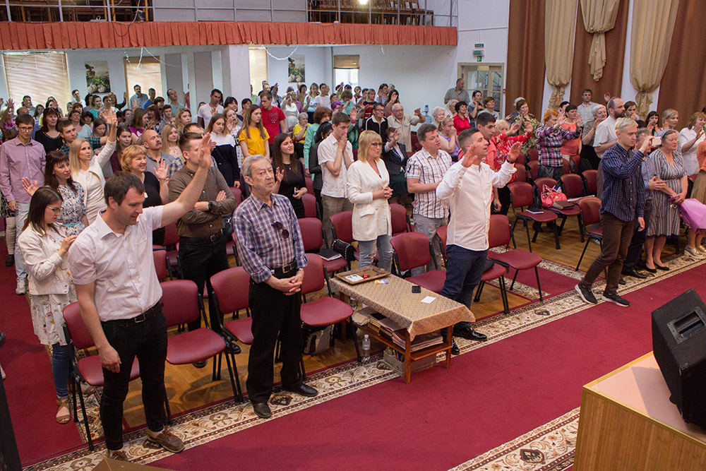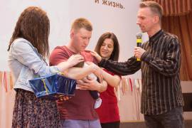 Помощники пастыря церкви "Свет жизни" Сергей и Людмила Охрименко молились и вместе с церковью призывали Божье благословение в жизнь ребенка и его родителей.