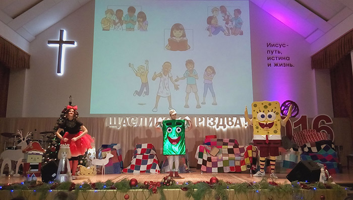 Детям и их родителям была представлена театральная постановка, герои которой рассказали Евангелие Иисуса Христа. На красочных картинках и слайдах Благая весть еще больше ожила, и дети наглядно увидели Божий замысел для жизни человека, от сотворения мира до примирительной жертвы Иисуса Христа.